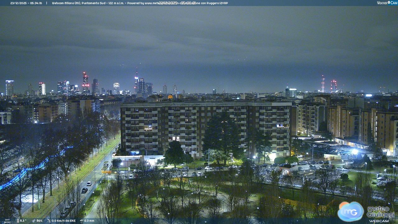 Webcam ad alta risoluzione Mobotix M26 di MeteoGiuliacci, installata nella zona Nord di Milano con ripresa verso Sud, in primo piano il centro direzionale della città, la Stazione Centrale è visibile sulla sinistra dell'immagine.