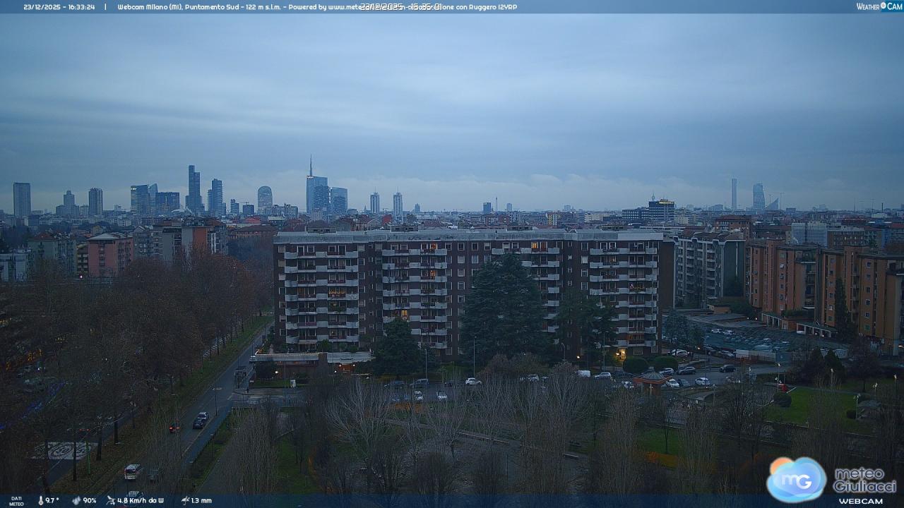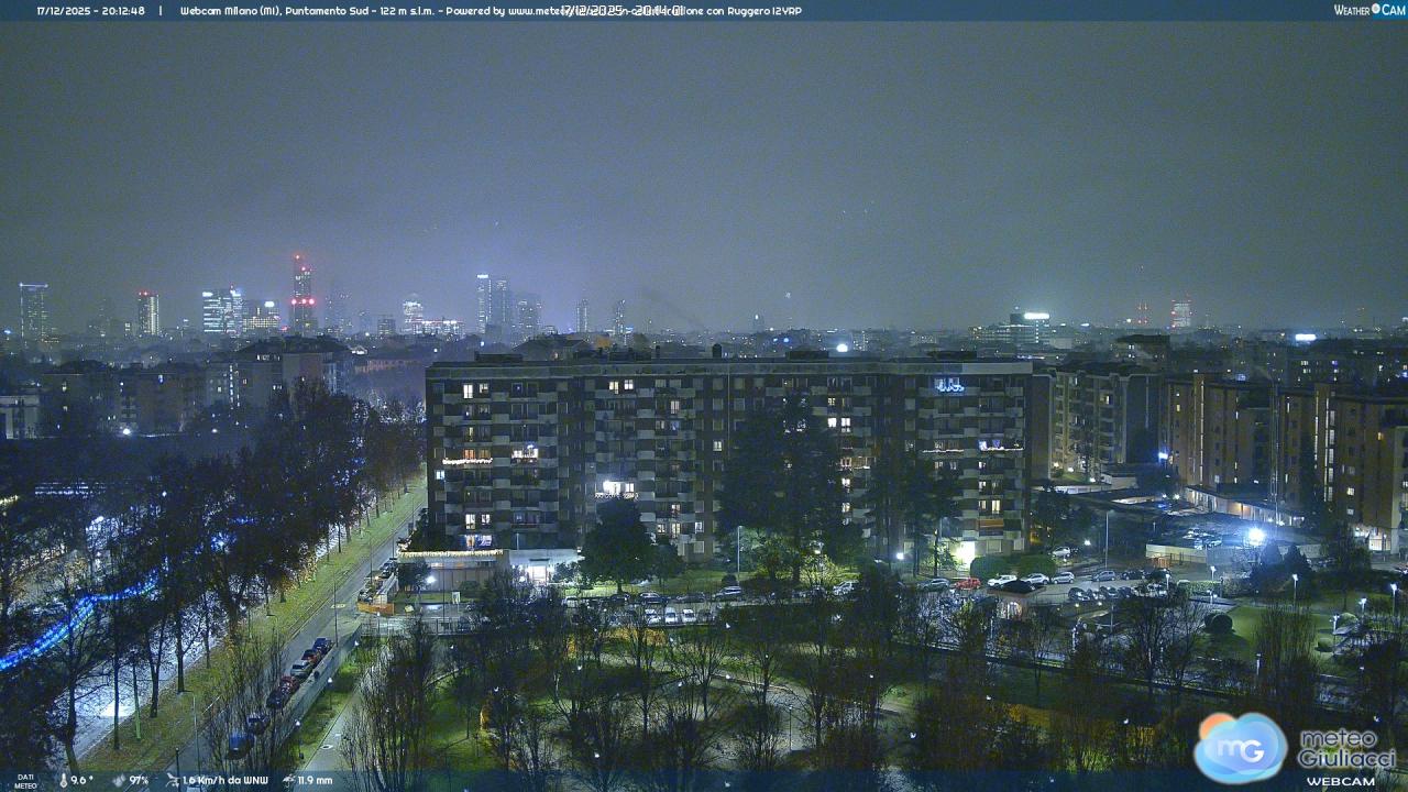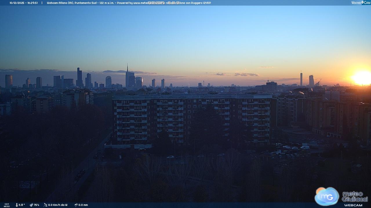 Webcam ad alta risoluzione Mobotix M26 di MeteoGiuliacci, installata nella zona Nord di Milano con ripresa verso Sud, in primo piano il centro direzionale della città, la Stazione Centrale è visibile sulla sinistra dell'immagine.