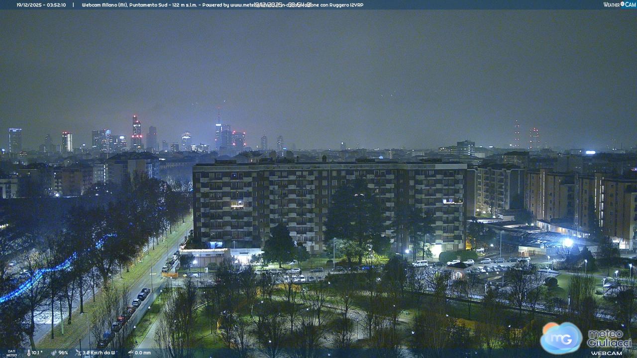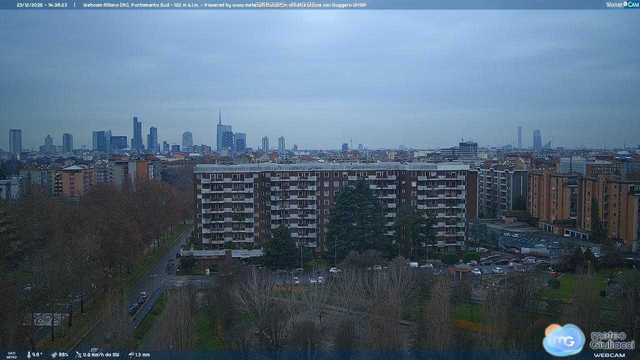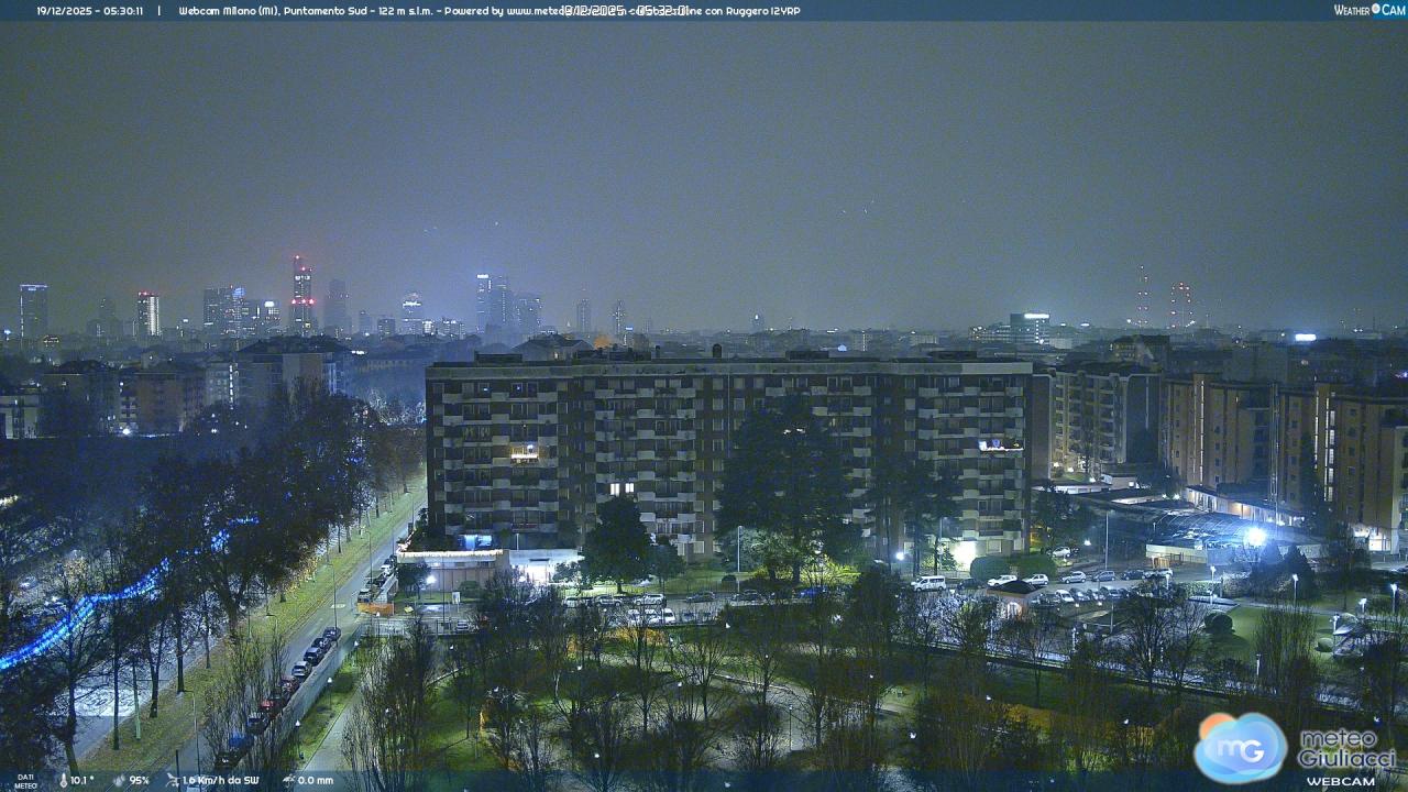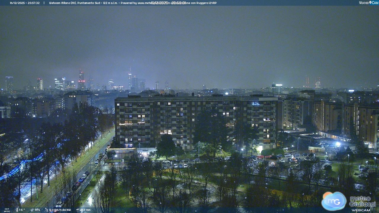 Webcam ad alta risoluzione Mobotix M26 di MeteoGiuliacci, installata nella zona Nord di Milano con ripresa verso Sud, in primo piano il centro direzionale della città, la Stazione Centrale è visibile sulla sinistra dell'immagine.
